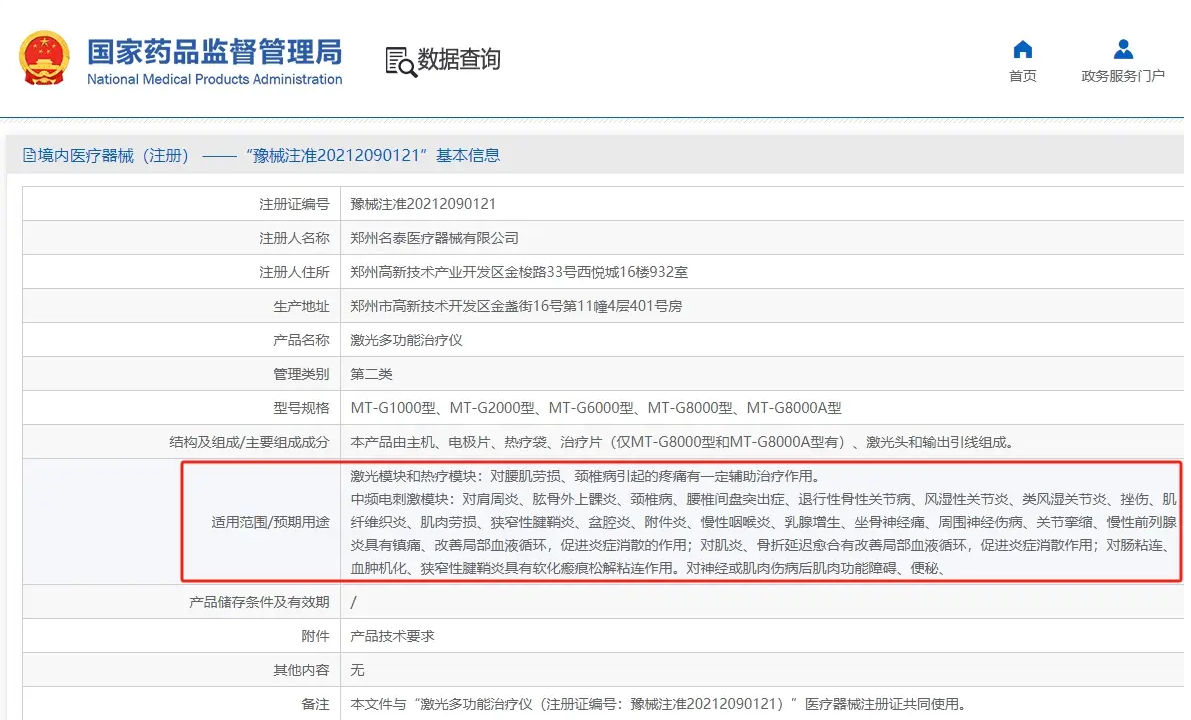 这条严格按照医疗器械生产质量管理规范建设的生产线,正是名泰激光多功能治疗仪的诞生地。作为名泰医疗的老牌明星产品,可在国家药品监督管理局官网查询相关适用范围,官方严审的资质,是我们带给万千家庭的“安心广告”。