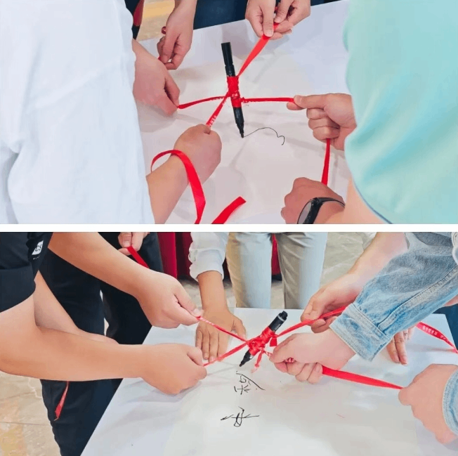 “神笔马良”的协作比拼环节,每组成员共同操控一支笔完成书写。紧盯笔的动态与字的书写,时刻调整力度与方向,在默契配合中加深互信,感受团队协作的重要性。