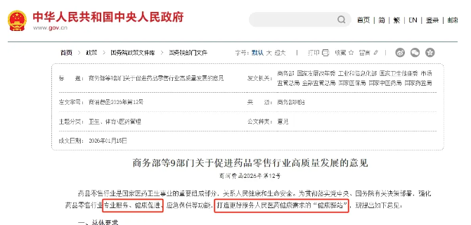 2026年1月,商务部、国家卫健委、国家医保局等9部门联合发布《关于促进药品零售行业高质量发展的意见》,为药店行业打开新的大门。